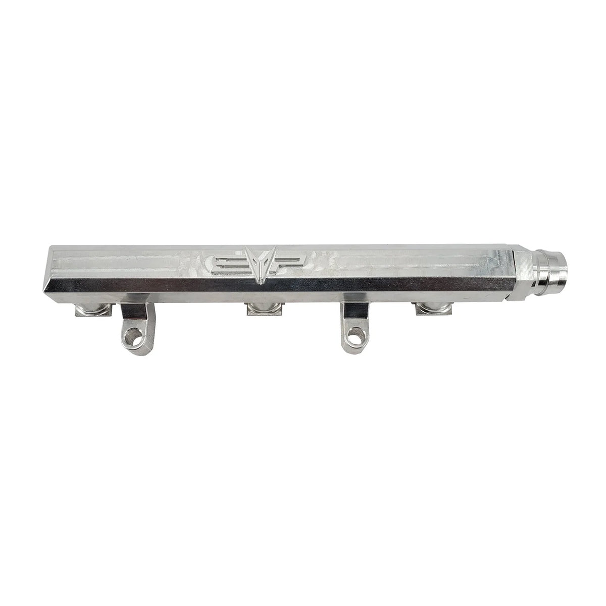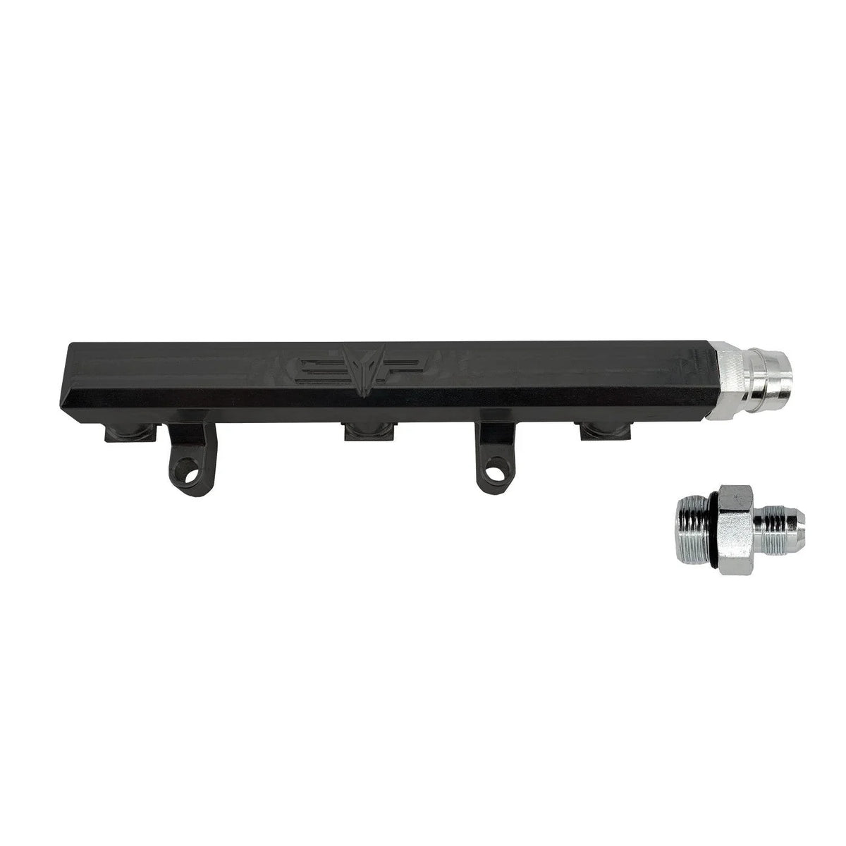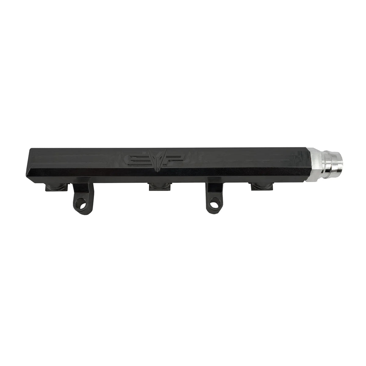 Because of the incredible power we are making in our big turbo and drag race cars, we needed a fuel rail that was adaptable to larger fuel hose and more secure AN style fittings. One of the biggest issues with the OEM fuel rail is the 5/16' supply hose and fitting. 500+ horsepower on alcohol (E85) based fuels requires a huge volume of fuel. The EVP billet fuel rail has a threaded boss so the OEM fuel hose adapter fitting can be swapped out for a -6AN o-ring boss (available separately). This allows the use of 3/8' fuel hose from the pump all the way to the rail. This will not only supply more fuel, but will lower the amp draw from the fuel pump.