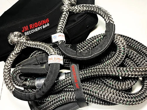 When it comes to off-road recovery there are many different ways to make fast, proper and safe recoveries. We are proud to offer our 100% American made kinetic recovery ropes. These ropes are designed to help take some of the load off the recovery points and equally distribute the load along the length of the rope. Our recovery ropes stretch up to 40% absorbing most of the shock load and producing a powerful but soft dynamic pull. With shock adsorption properties similar to nylon but with higher capacities than than your standard nylon or polyester our high performance rope makes it the best choice for recovery or pulling ropes. We use a high force composite double braid nylon construction with a polyester cover for abrasion resistance and durability along with a nylon core for stretch and performance. By using a polyester cover and a nylon core the outer polyester cover will not over-stretch the core, this makes our recovery ropes stretch uniformly allowing more power to go to the rope. All our ropes come with a black marine grade urethane coating that penetrates the outer cover and adds additional protection to the core while also increasing abrasion resistance. This type of coating is also soft and flexible which makes your recovery rope much easier to handle and less likely to pick up dirt and debris. All our spliced recovery ropes have an 8" eye with a rugged black ballistic cordura sleeve for added wear protection in the eye. When choosing a recovery rope it is best to figure a rope that has 4 times the capacity of the weight of your vehicle. For example, if your vehicle weighs 5,000lbs a rope with at least 35,000lbs capacity or more would be required, our 7/16" line rated at 31,000lbs would be an excellent choice.