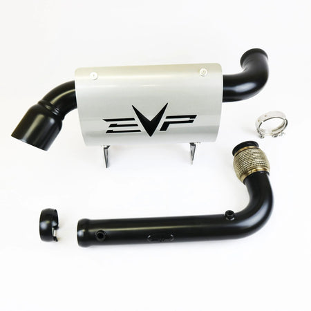 Most racers and customers want a good looking exhaust that is not obnoxiously loud. Here EVP delivers on both fronts. The brushed stainless MAGNUS is big and beefy with an EVP and signature heat shield and a massive 4.5' tip. BLACK MAGNUS is ceramic coated black, which not only looks badass but keeps exhaust velocity up by holding heat in the pipe. Each MAGNUS features an EVP custom built muffler designed specifically for the X3, making the exhaust note the perfect blend of sound without being excessively loud.