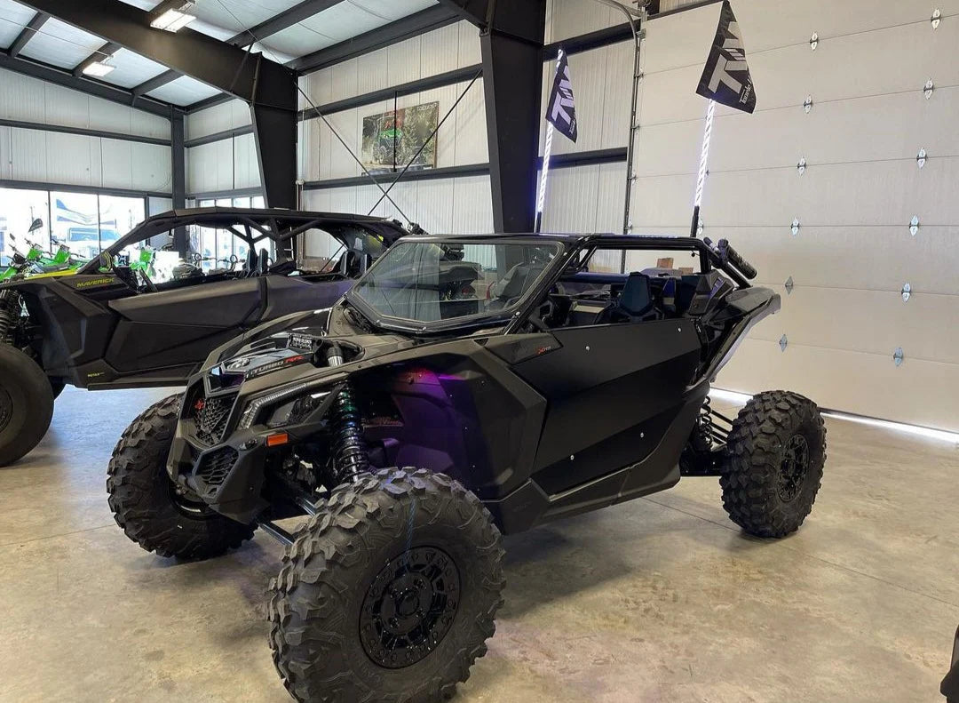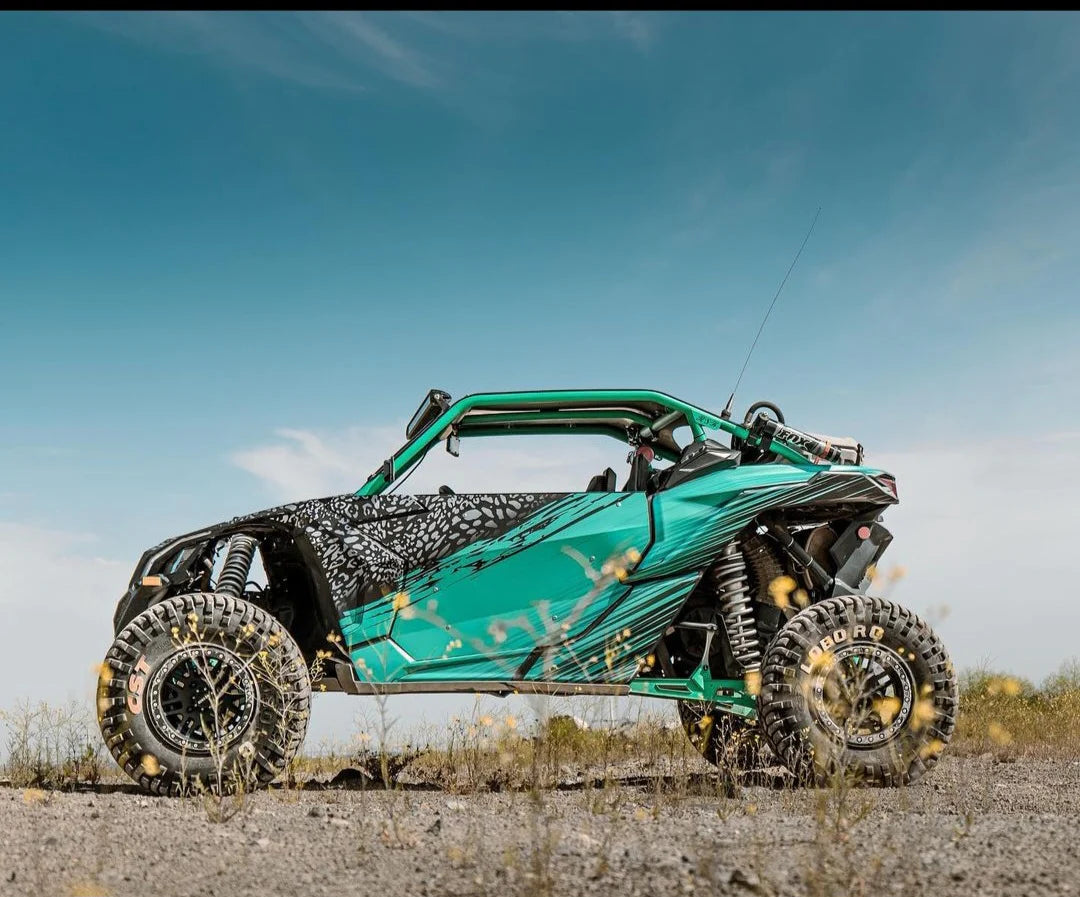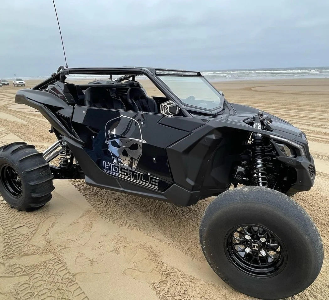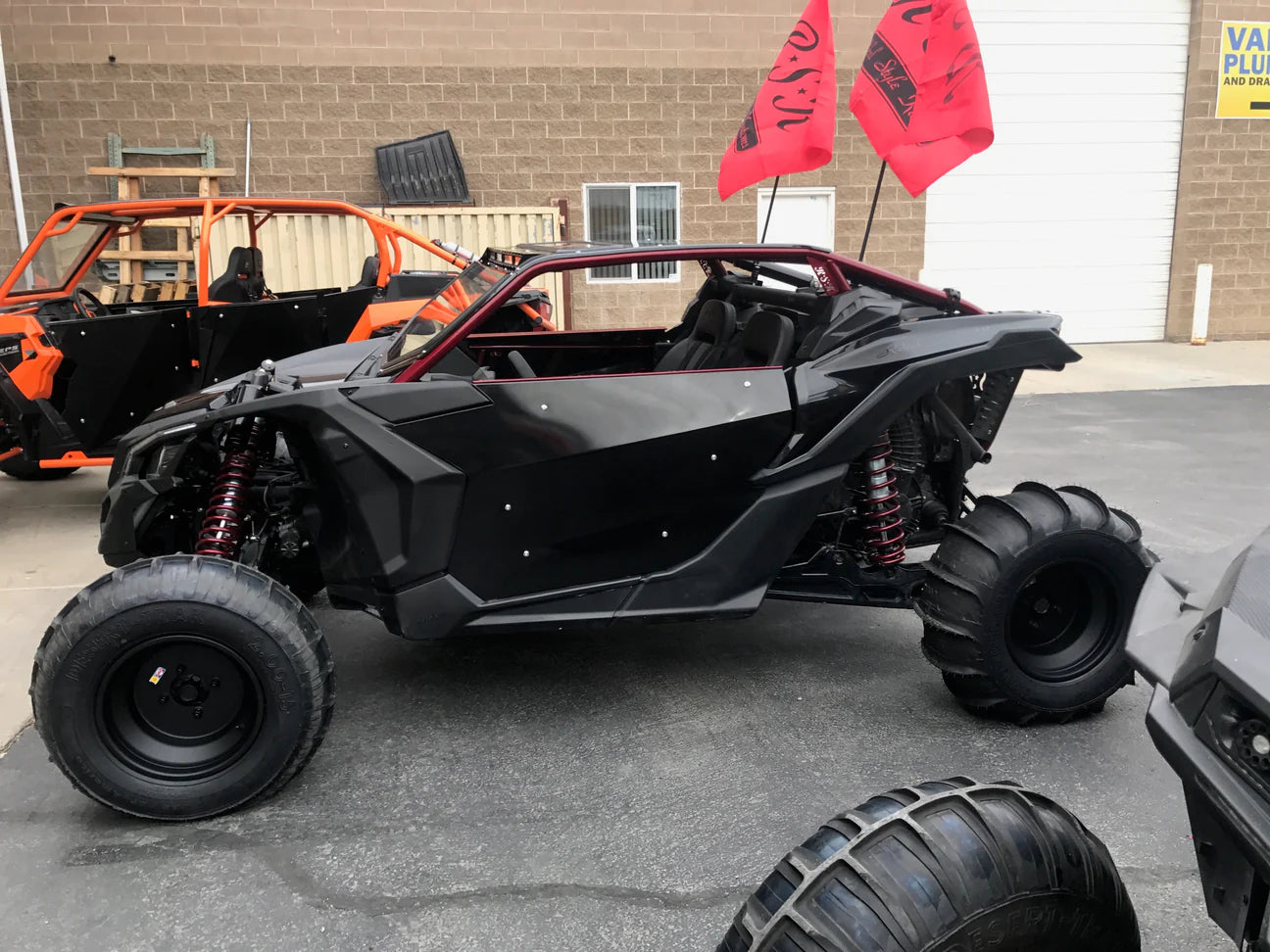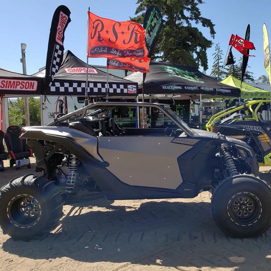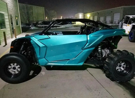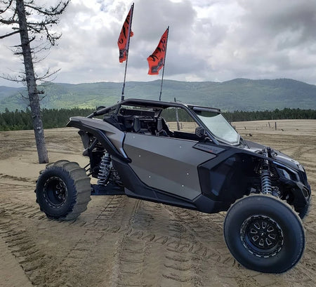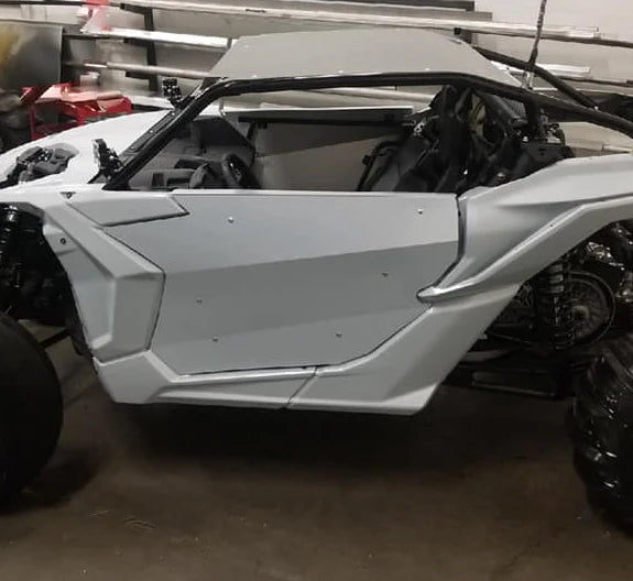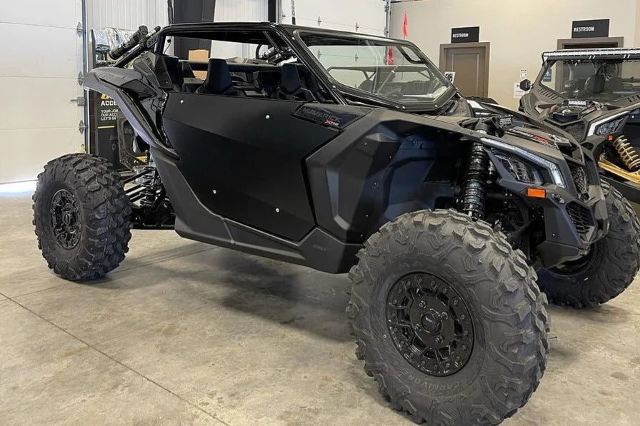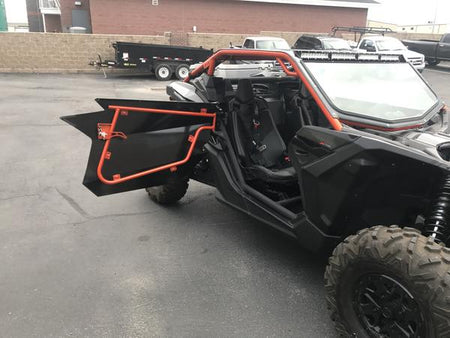 The R*S*K 2 Seat Can Am X3 Doors attach to your stock hinges and are easy to install. Top cap makes for a sleek and comfortable design. Doors include: steel frames, aluminum skins, handles, cables, top caps and adjustable latch plates *You will re-use your stock (OEM) pivots and latches. Doors available raw or powder coated Black. (Color match other than Black only available with cage order.)