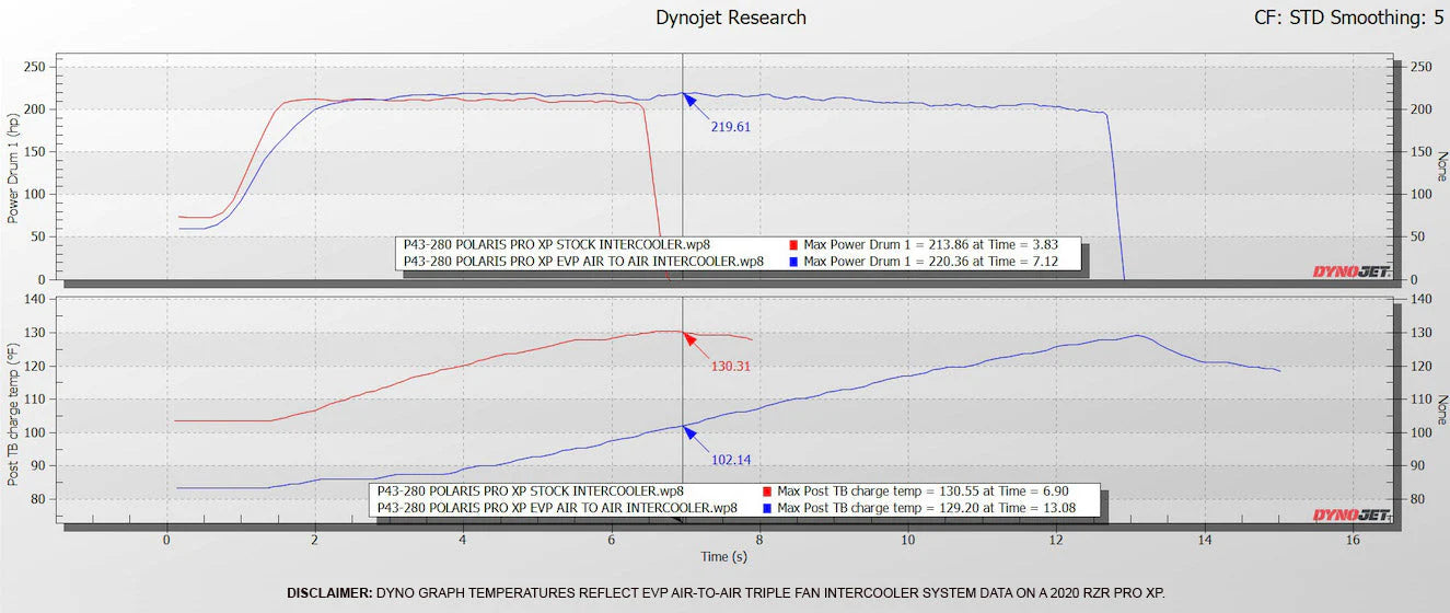 The EVP Air-to-Air Dual-Fan Intercooler for XPT/S models is made in the U.S.A. and built to withstand incredibly high temperature and pressure levels to effectively cool and regulate airflow to the engine. Through testing and development, this air-to-air setup consistently REDUCED intake temperatures on Paragon-equipped RZR's compared to tuned RZR's with the OEM water-to-air unit, despite the big turbo systems providing 10 more pounds of boost and 60+ more HP. The EVP Air-to-Air Intercooler setup also helps enhance ignition settings in addition to improving airflow efficiency, allowing the engine to make more power with improved performance without breaking down vital components. This is an absolute game-changer for anyone looking to make safe, reliable big power numbers with their RZR.