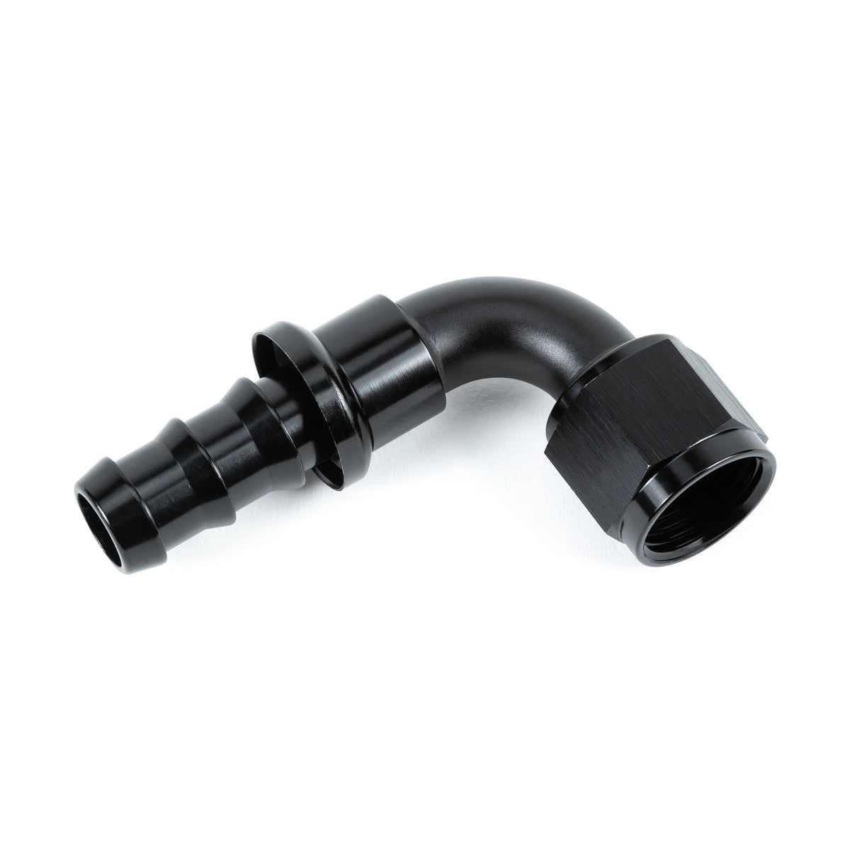 This high-quality aluminum -10AN to 5/8 Push-On 90-Degree Hose-End Fitting allows X3 models equipped with an EVP TPR Billet Valve Cover to attach the crankcase vent to either the intake boot or catch can (if equipped).