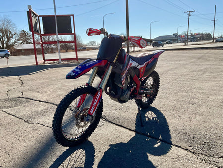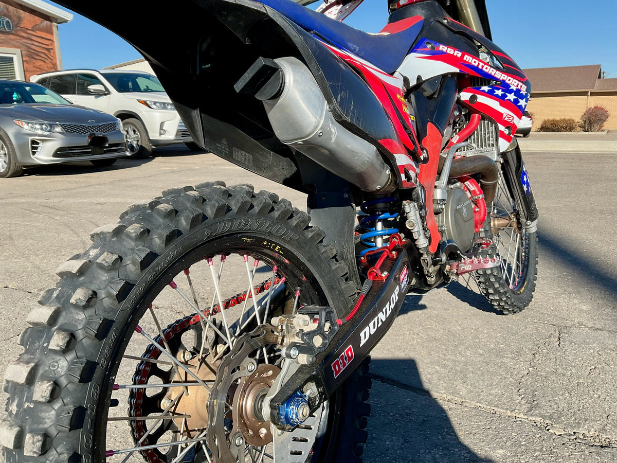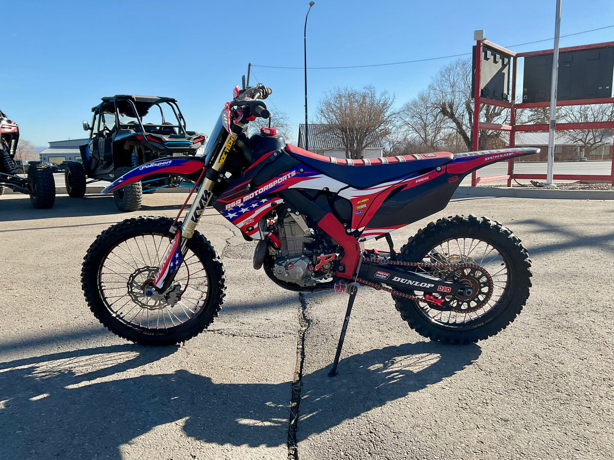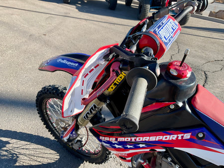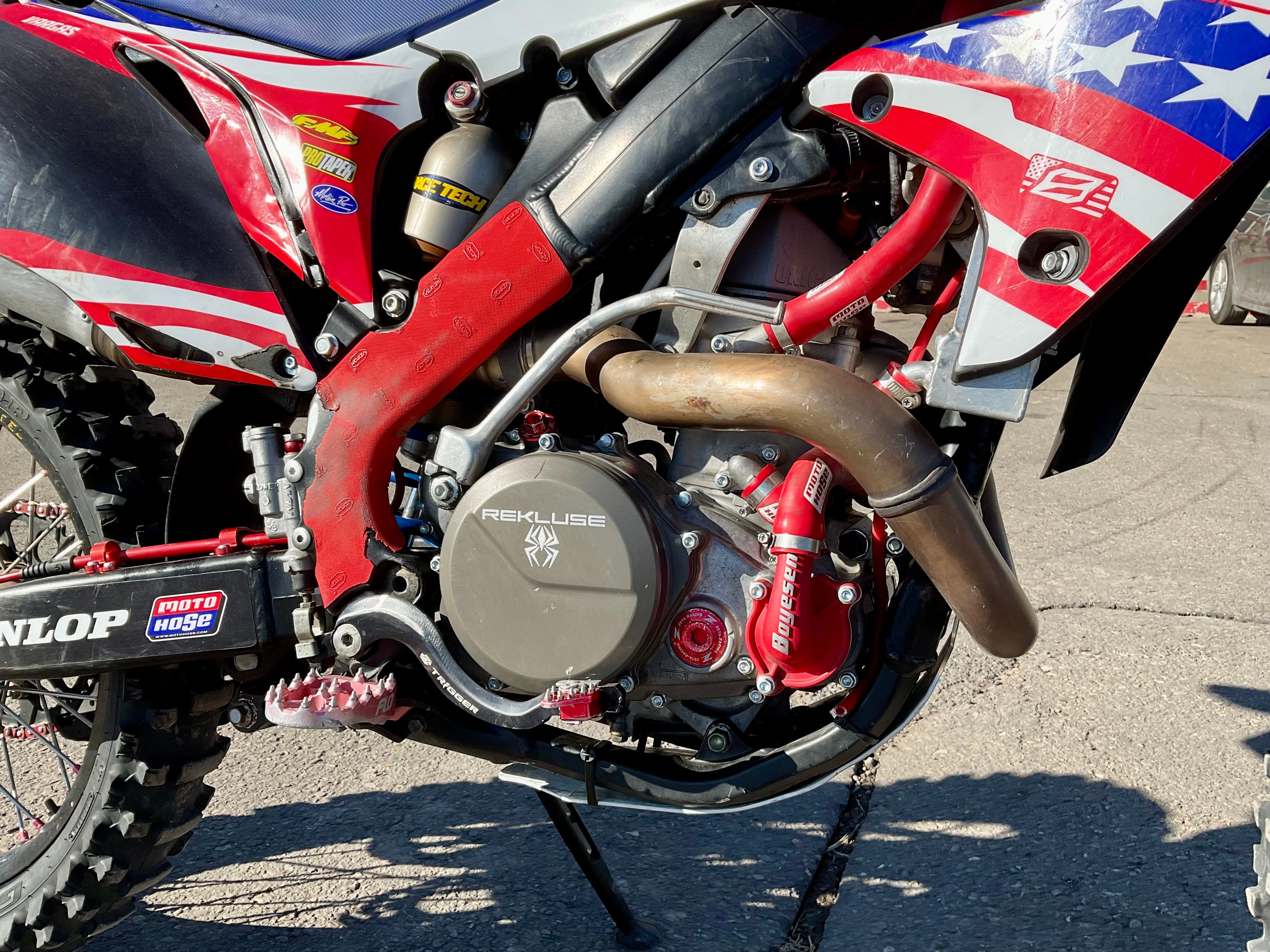 This bike has a Rekluse clutch, FMF exhaust, Flo levers, Foot pegs, Excel race wheels, custom graphics and seat.