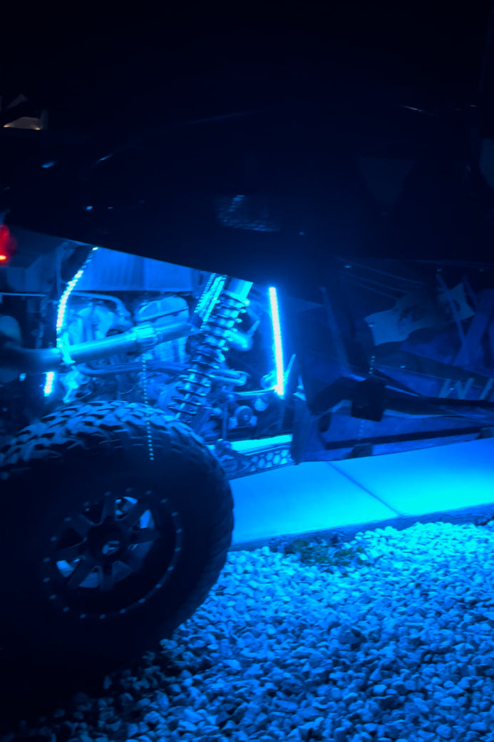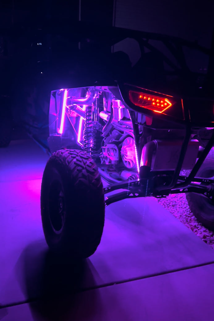 This Stage 2 Underglow kit is designed for the RZR specifically. We’ve matched up the perfect lengths of LEDs to pair up perfectly to the RZR frame. This kit offers tons of functionality, light output, and a cool aesthetic. It also uses the same app as our Whips, Interior Lights, Fang Lights and more. With a touch of a button on the included RF remote or through the Bluetooth app, you can have your entire car glowing exactly the way you want. We will walk you through how to route the LEDs to replicate the exact result you see on our 2018 XP4T. This kit includes 12 strips that provide ultimate light output and a clean install. Enabling your ride to have one of a kind a looks and the visibility to make sure you are noticed out on the trail or on the Dunes.