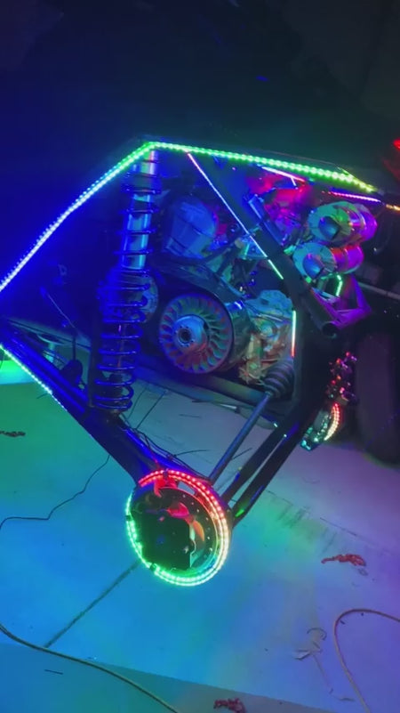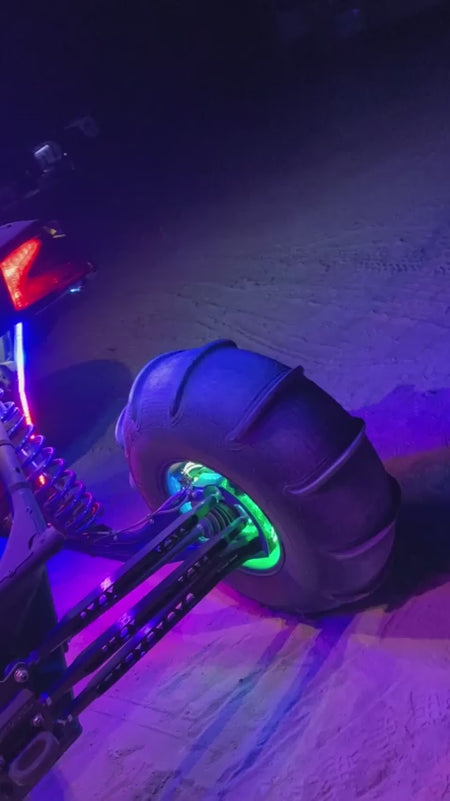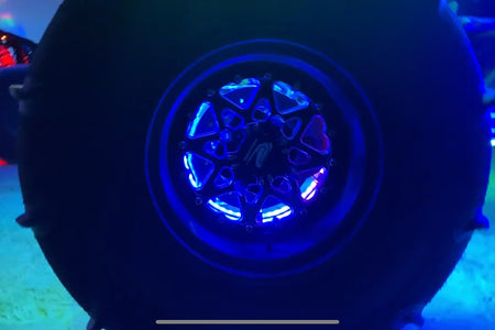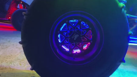 The all-new MB Wheel Rings are the perfect addition to any UTV or offroad vehicle. These are available in 12 inch or 17 inch rings with dual row LEDs designed to light up the wheels and underside of your vehicle. With Bluetooth and Remote control features you can control them how you like. These pair perfectly with our other led options giving you a full car color control theme with a press of a button. These can also tie into your turn signals and function as additional turn signals or go red for braking.