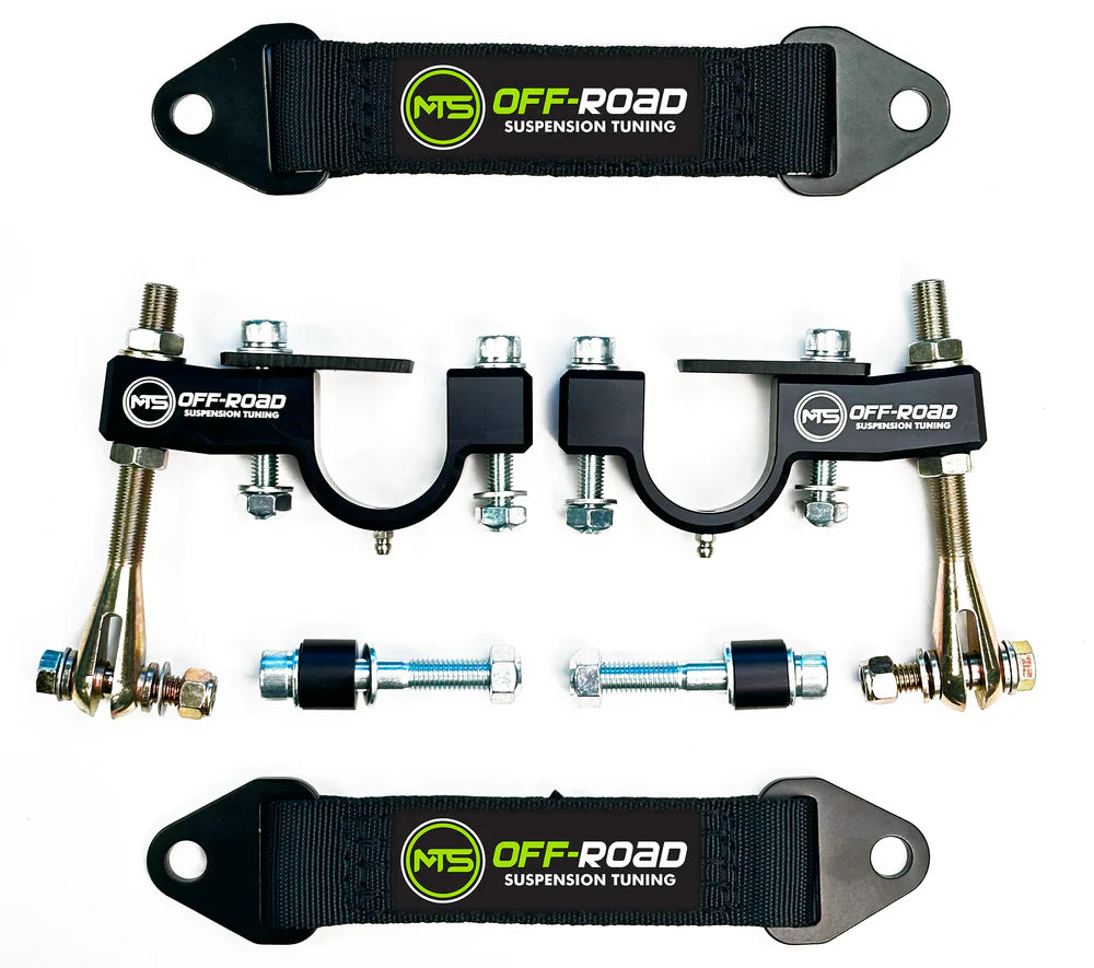 After testing here at MTS we have found that traditional style RZR Limit Straps bolting to the shock eyelet have proven to side-load the shock fork on the new Pro R and Turbo R. This can cause the shaft to bend or break under the pressure. MTS Off-Road's new swaybar mounted limit straps eliminate this problem while still providing lasting durability and protection for your shocks.