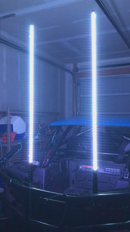The Sync'd E-Spektrum Whips are a perfect addition to side by sides, ATVs, or any offroad vehicle. The E-Spektrum whip features a double-sided row of high-powered LEDs that provide a unique look along with powerful lighting. These LEDs are adjustable so they can run through any one of over 300 hundred patterns and light effects ranging in all colors. Each Whip comes with a base that makes install a breeze. Simply run power and ground to the controller and you can then run the controller wires up to each whip.