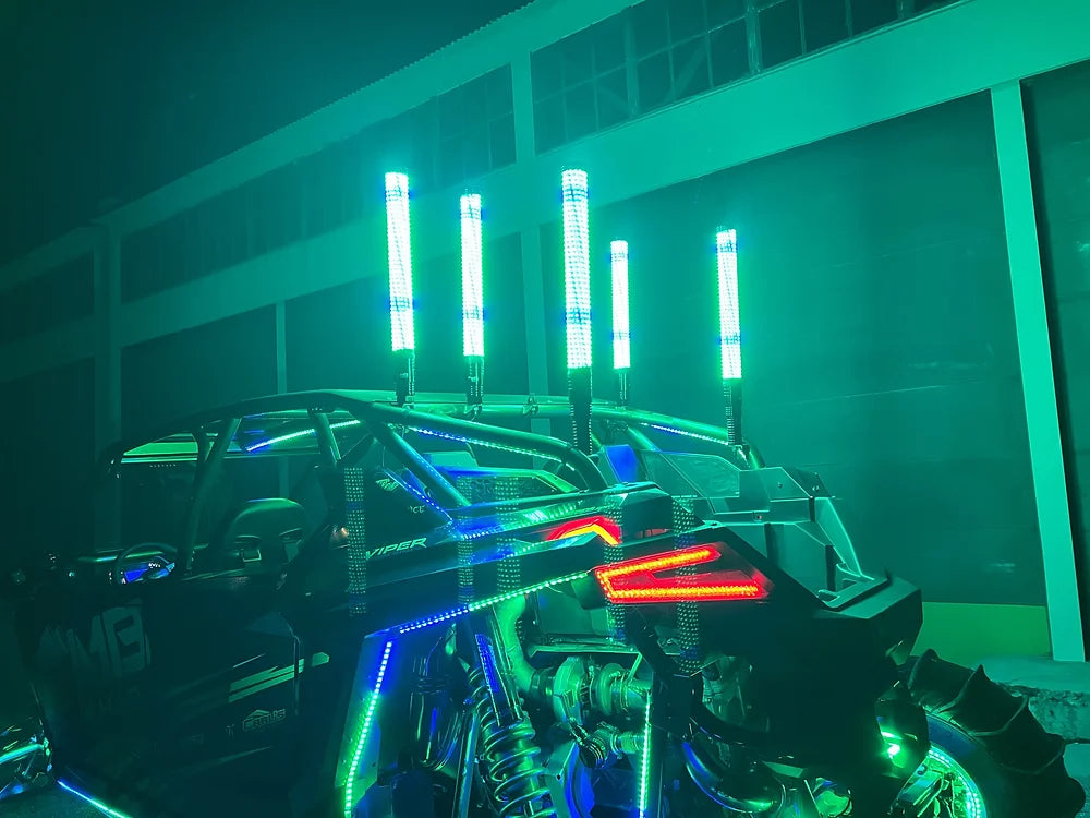 The original Flash Pro 2" thick whip, burst onto the scene and was an instant favorite of dune and trail riders alike. However, we don't stop innovating just because we designed and released the first and the best 2" thick whip on the market, we keep it moving and designed the new V2. The V2 is bigger, it is brighter, it is lighter. It is improved across the board. We've reduced the weight by over a half a pound, we've added 2 more inches in length, and last but not least, added nearly 200 LED's per whip with a total of 600 LEDs per whip! Our whip bases feature a hybrid of stainless steel cores to improve strength and billet annodized outer mount to keep it looking clean.